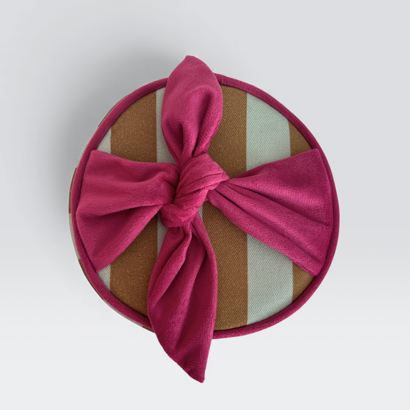 O shape redondo garante espaço generoso, enquanto o acabamento listrado e o laço de veludo trazem aquela estética sofisticada com toque vintage, perfeita para o verão, para presentear ou para fazer parte da sua mala de final de ano.